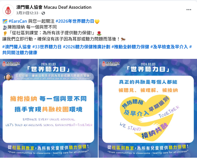 This year, we will host a series of workshops and talks in selected schools across Macau. Students will be invited to join the initiative as “Hearing Ambassadors,” responsible for promoting hearing awareness and educating the wider community. In addition, we will produce fun, hearing-care related cartoons tailored for kindergarten and primary students, making learning both enjoyable and accessible. Our goal is to place a stronger emphasis on creative teaching and meaningful engagement in the year ahead.