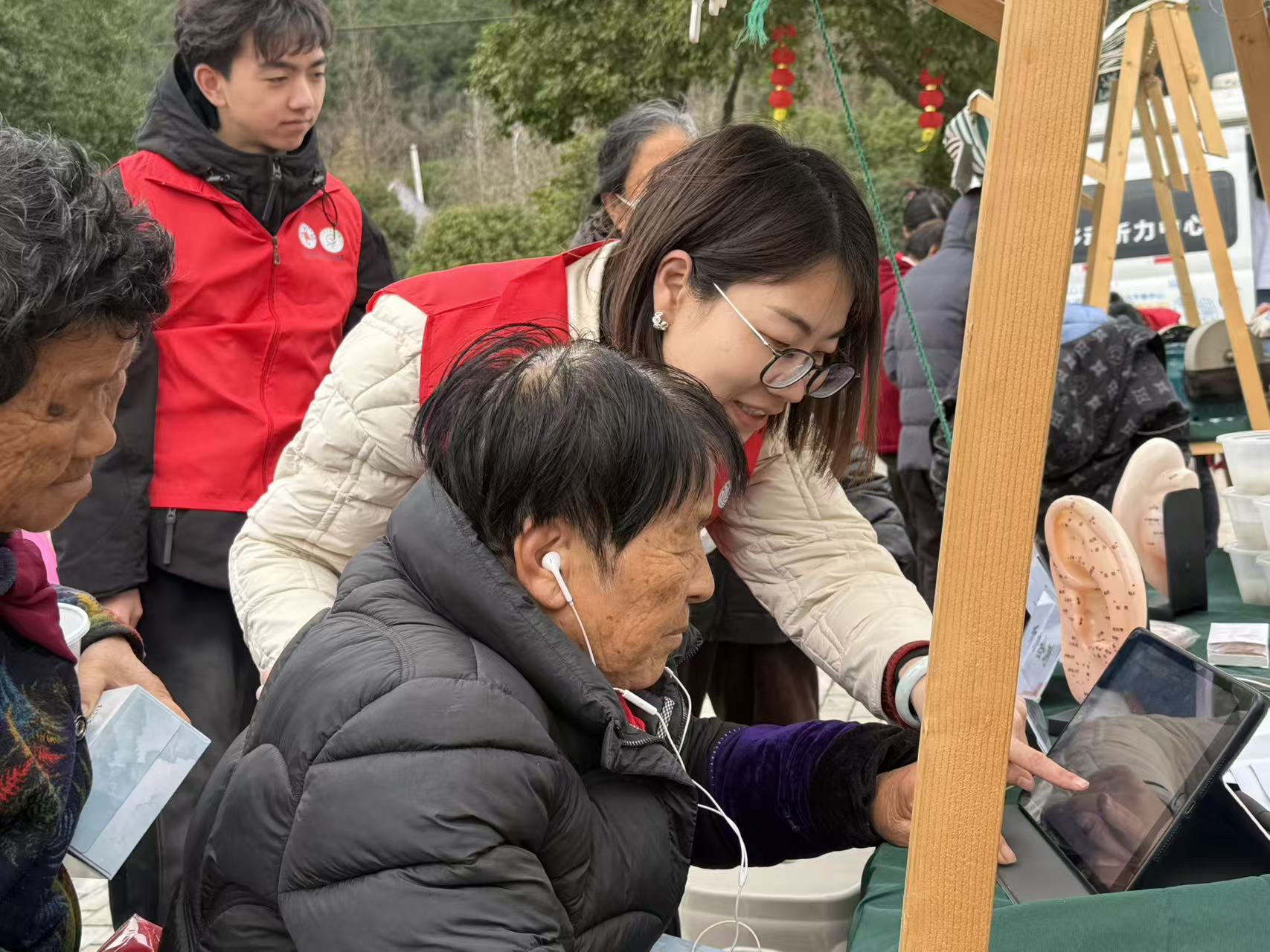 During this Ear Care Day event, the team established a hearing testing service area to conduct hearing screenings for residents; set up a medical insurance policy consultation zone to promote ear-related services and medical insurance policies; and created a specialized ear care service area to explain the health benefits of auricular acupressure, perform auricular acupressure patches, and provide personalized ear care recommendations based on dietary and lifestyle habits.