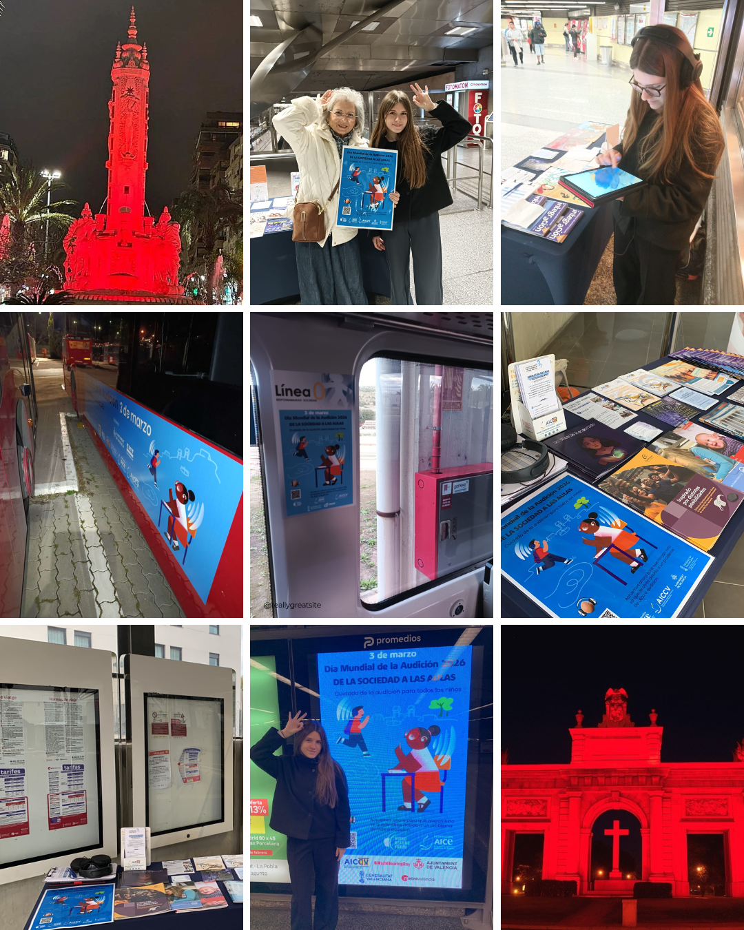 – Illumination: In the Valencian Community, AICCV has energetically promoted the illumination in red of emblematic monuments as a symbol of support for people with hearing loss. Among the illuminated monuments were the Porta la Mar in Valencia, the Town Hall of San Vicente del Raspeig, and the fountain in the Plaza Mayor of Castellón, helping to visually reinforce the campaigns message throughout the region.