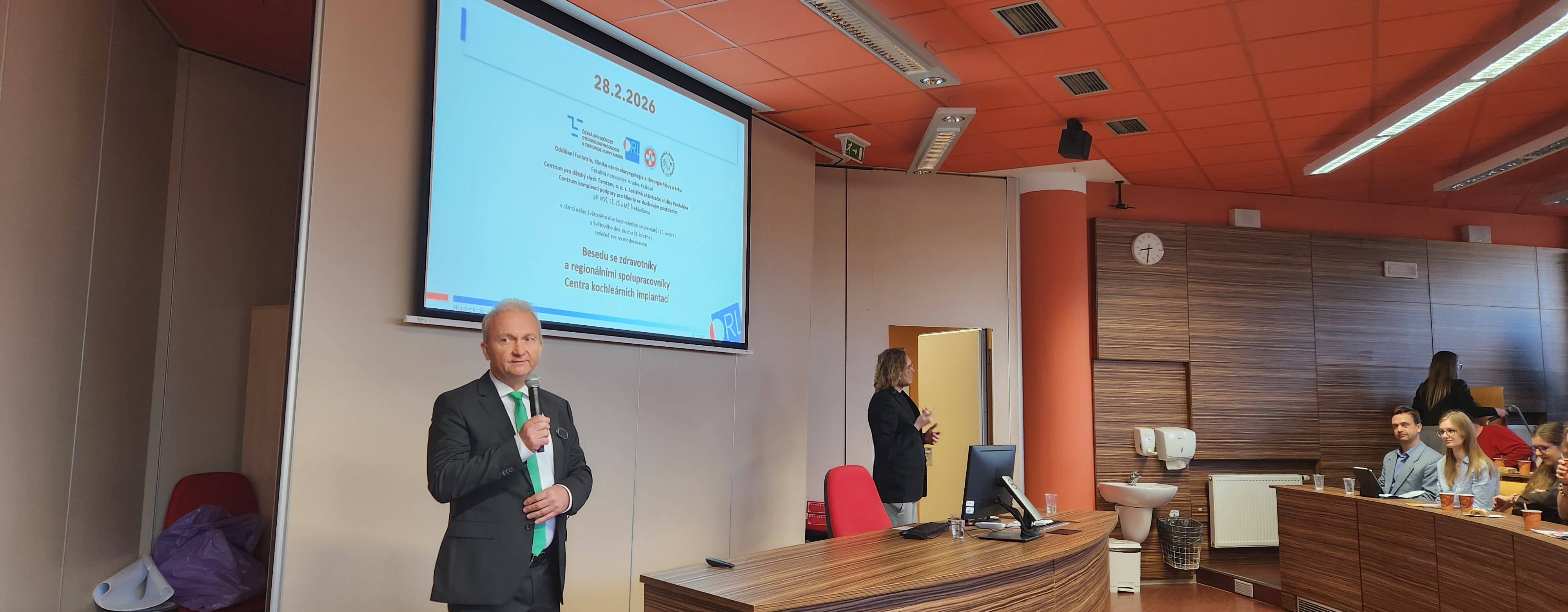 On February 28, 2026, the ORLHNS University Hospital Hradec Králové Clinic celebrated important international WHO days (International Cochlear Implant Day on February 28 and World Hearing Day on March 3). The main event was the “Discussion of Cochlear Implant Users with Experts from the Implantation Center of the University Hospital Hradec Králové” in the premises of the Psychiatric Clinic of the University Hospital Hradec Králové. The meeting was organized by specialists from the ENT clinic. Interpretation into Czech sign language was provided by Bc. Michal Procházka from the Hradec Center for People with Hearing Impairments. The main message was to emphasize trust and mutual cooperation between patients and experts from healthcare, education, and social organizations.